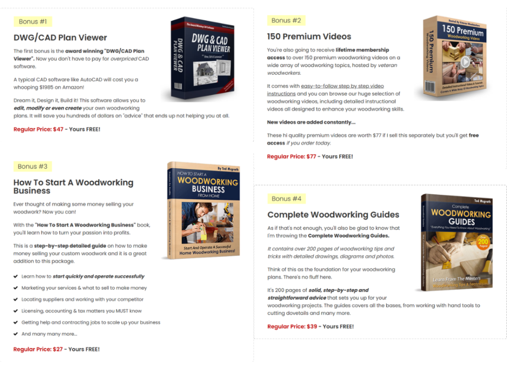 Get your access to Ted’s Woodworkin’ today and receive an incredible set of 4 bonuses.